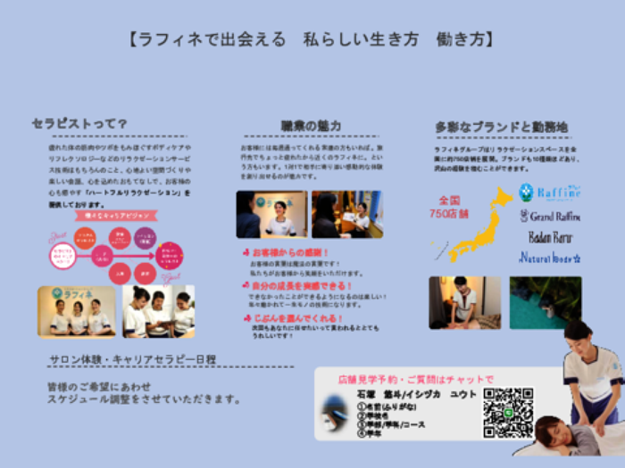 メインブランドであるラフィネをはじめに、整体のブランドであるナチュラルボディ、オイル・トリートメントを扱うバダンバルーやグランラフィネなど、たくさんのブランドからたくさんの技術を学び、様々なお客様に対してサービスを提供していきます。