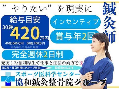 スポーツ医科学センター 協和鍼灸整骨院グループ【東京都・神奈川県】鍼灸整骨院グループ◆基本給24万円~50万円+手当スタート!◆賞与年2回!◆週休2日◆昇級随時!◆年間休日数120日◆引っ越し費用負担◆グループ提携整形外科あり◆東京・神奈川で展開中!◆勤務地相談可能!◆