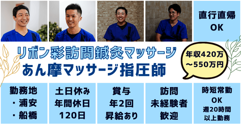 リボン彩訪問鍼灸マッサージ【千葉県浦安市/船橋市】スタッフ募集(あん摩マッサージ指圧師)
