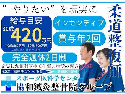 スポーツ医科学センター 協和鍼灸整骨院グループ【東京都・神奈川県】鍼灸整骨院グループ◆基本給24万円~50万円+手当スタート!◆賞与年2回!◆週休2日◆昇級随時!◆年間休日数120日◆引っ越し費用負担◆グループ提携整形外科あり◆東京・神奈川で展開中!◆勤務地相談可能!◆