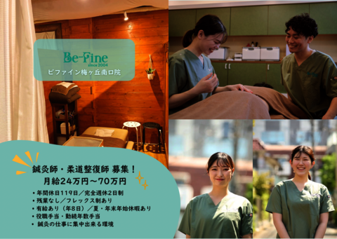 ビファイン鍼灸治療院は株式会社リアリが運営をしています。 ビファイングループは「あきらめない人生の提供」を理念としています! ①全力で教えます 私達は常に最高度の高い技術をもったプロフェッショナル軍団を目指しています。 そのために必要なことはすべて惜しみなく全力でお伝えします。妥協は絶対にしません! ②やる気が大切 素直に一生懸命に仕事をやれる人を評価します。 出来ないことが多いのは当たり前!決して諦めない気持ちを大切にしています。 ③ライフステージの変化にも対応 結婚・出産等、ライフスタイルの変化によりやむを得なく職場を離れなければいけないということを減らすべく、長く安心して働くことが出来る環境をご用意しています。 笑顔と活気で溢れる職場。 治療家として、人として、ハイスピードで成長でき、患者さんや仲間から必要とされている喜びを知ることができます。 他では積めないスピードで治療経験が積める! 1年後、信頼を集めるプロの熟練治療家になりませんか? あなたのご応募、心よりお待ちしております。 |