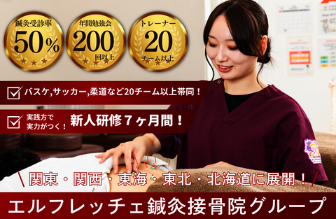 【自由に学べる!エルフレッチェスクール】 -なりたい自分に向かって- ●トレーナー科 ●鍼灸科 ●外傷科 ●美容科 4つの勉強会を毎月開催! 自主参加性の勉強会を通して 自分の学びたいことをどんどん学んでいただけます。 【自分の成長に合わせた評価システム】 自分の成長スピードに応じた評価システムを導入! できることが増えた分、1年目でも給与に反映してます。 勤務経験が重要ではなく自分が少しずつでもできることが増えて行くこと、 つまり 『成長』 がテーマです! 【チャンスがたくさん!】 エルフレッチェはまだまだ小さい会社ですが 2029年 までに 200店舗 の開設を目指しています。 院の数=院長の数 です。 つまりこれから 100人 を超える院長を育成していく計画です。 成長企業のなかで新人の先生としての働き方だけでなく、 自分自身が運営や経営を身につけていく働き方も狙っていけます! 最短1年で院長になったスタッフも多数在籍。 【幅広い治療技術】 エルフレッチェの治療方針は予防医学です。 時代のニーズとして外傷対応や痛みをとる目の前の症状対応のみならず 慢性疾患や・生活の影響からくる身体のトラブルに対しての治療も これからの治療家には必須スキルとなってきます。 姿勢矯正・筋膜矯正・骨格矯正・スポーツマッサージ FTP鍼灸テクニック |