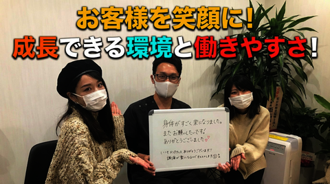 | 応募条件 | 柔道整復師(国家資格取得予定者含む)、鍼灸師(国家資格取得予定者含む)、整体師(1年以上の経験者歓迎☆未経験もOK) |