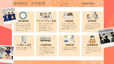 【福利厚生】 家賃補助(配属院から3㎞圏内)、夕食配膳(一人暮らし対象)、産休・育休休暇、出産手当、健康診断、引っ越し支援 |