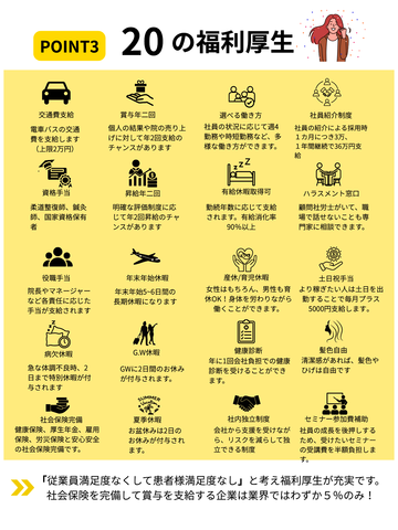 ・社会保険・雇用保険・労災保険 ・健康診断 ・独立・開業支援あり ・制服貸与 ・研修制度 ・技術研修 ・新人研修(ビジネスマナー) ・幹部研修 ・技術勉強会(症例検討会含む) 平日昼休み実施 ・半年に一度キャリアパスを行うことで昇進 ・交通費支給(上限2万円) ・引越し手当10万円 (徒歩、自転車圏内の交通費がかからない場所への引っ越しの場合) ・社員旅行有り(代休あり) ・外部講師勉強会(徒手療法、整形外科医、プロアスレティックトレーナーなど) |