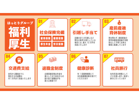 研修制度あり(労働局認可) 健康保険、厚生年金、雇用保険、労災保険、施術損害保険 企業型確定拠出年金・退職金制度 交通費支給(上限16,500円/月) 健康診断(会社負担) 年次有給休暇(100%消化推奨) 特別休暇、慶弔休暇 年末年始、春夏休暇(有休消化) 産前・産後育児休暇(男女共に実績あり、女性スタッフは100%取得実績あり) 介護休暇 時短勤務実績あり フィットネスジム利用(無料) 白衣/制服貸与 社員旅行(1回/年) 引越し費用補助(上限10万・審査あり) 施術スキルアップのための勉強会あり 教育体制・研修 研修制度あり 労働局認可の有期型実習訓練6か月間(OFF-JT,OJT)を実施しており、基礎をしっかりと学べます。また、外部からマナー講師を招いた研修もあり社会人として大切な心構えも学ぶことができます。 尚、ブラザー制度で安心サポート |