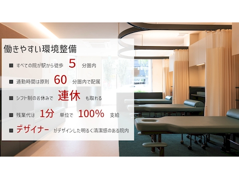 ▼ぷらすPOINT! 1.手技治療メイン! 機器ではなく、自分たちの手に力を付けることで、きめ細かくに患者様の状態を把握しアプローチすることが可能です。 2.自費治療70%・鍼灸割合50%で臨床経験が確実に積める! 「治す」ことにこだわった幅広い治療メニューが豊富にあります。 また、鍼灸を受ける患者様が多いため確実に経験を積むことが可能です! 3.オリンピック選手にも通用する技術実績! 高いレベルの技術を整骨院現場でも行い、そのままトレーナー活動に生かしているメンバーも多くいます! 4.新人研修2カ月間でしっかり基礎から学べる! 教育専門部署の先生が入社当初~年間を通して研修を行うので、着実に力を付けることができます。 5.入社1年目はマンツーマンで先輩が寄り添ってくれるブラザー制度あり 1人で悩むことなく、先輩が必ずサポートします。新入社員1人につき、専属の先輩を付けるので、あなたの成長だけを考えて寄り添います。 6.月9日間お休み、完全週休2日制、有給消化率80%! オンオフをはっきりとしてメリハリ持って働く社風です。 7.サービス残業ゼロ! 遅くまで残って残業・・なんてことはありません! 当社では1分単位で残業代を100%支給しているので帰れる仕組みがあります。 ▼学生さんへのメッセージ ぷらすの柔道整復師・鍼灸師のミッションは「施術をする」ことではなく「施術を通して患者様の人生をより良いものにする」ことです。 それを実現するために患者様1人ひとりに合わせた治療や根本治療を行っており、メンバーに求めるスキルはとても高いです。 でも安心してください。毎年ぷらすに入社する新入社員のみんなが持っているものは「整骨院でのアルバイト経験」や「クラス1位の学力」ではありません、「患者様のために成長したい!」という想いだけです。 その想いがあれば、必ず「患者様の人生にぷらすを与える」治療家にしてみせます。 ともに「人生を変えられる治療家」になりましょう! |