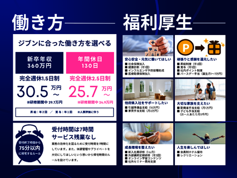 ■平日 午前:9:00~12:00 午後:15:30~19:30 ■土曜 9:00~13:00 ※受付時間は配属先により多少異なります。 ■休日 シフト制 ■休暇 年末年始休暇 夏季休暇 有給休暇 育児休暇 慶弔休暇 |