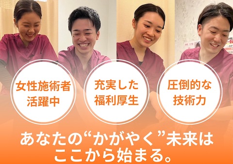☆★学べる技術★☆ 〇かがやき式筋バランス療法で高水準の技術を学べる! 大学病院で研究開発された治療法で、 大学病院リハビリテーション科など、多くの整形外科病院・整骨院などで使われている最先端の治療方法を学べます。 筋肉一本一本を触り分けるMT-MPS療法を用いて筋肉調整を行います。 〇根本改善で繰り返さない身体づくり 多様な骨格調整(骨盤矯正・猫背矯正・インパクト矯正(振動矯正)・トムソンベッド矯正・産後骨盤矯正)+最先端機械で行うインナーマッスルトレーニングで根本的な改善を目指します。 〇自律神経&美容へアプローチ フットケア、ヘッドマッサージ、ハンドマッサージなどのリラクゼーションメニューでストレスケアや不定愁訴にも対応。 酵素栄養学に基づいた食生活カウンセリング、美容鍼でお肌のアプローチも◎ お身体のどんなお悩みにも対応できるよう、様々なメニューを導入しています。 かがやきグループで、一緒に輝く人生を創るお手伝いをしませんか? |