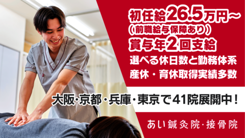 【柔道整復師/鍼灸師/あん摩師】 ・月給26.5万円~ W免許(柔整+鍼灸・あん摩のうちどれか2つ保有で)27.5万円~ ・試用期間6か月間 ・試用期間中給与変動なし |